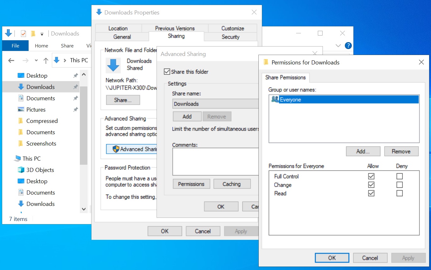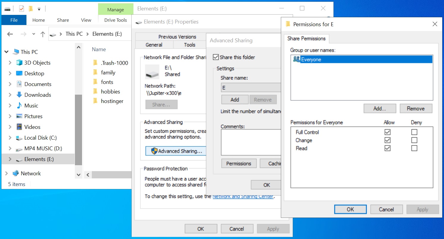 2. Pilih folder / disk yang mau share –> Pilih properties –> Sharing –> Permission –> Allow full control, change dan read.